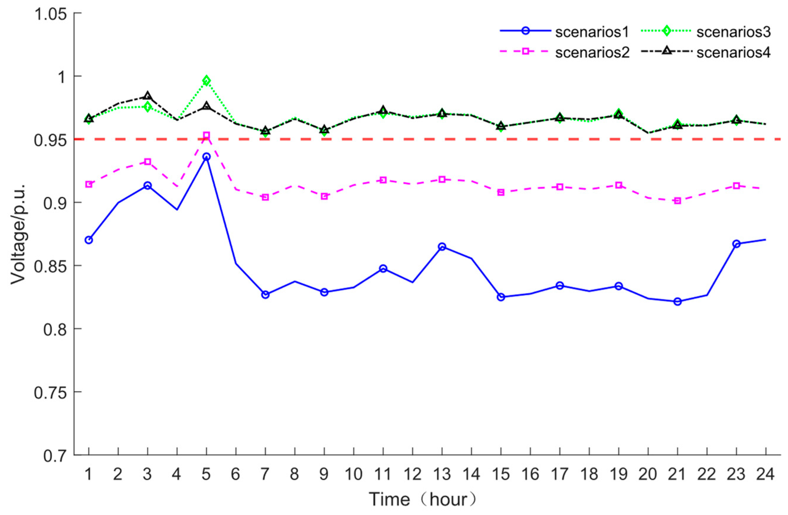 - Optimized Scheduling Constraints: This refers to adjusting (reducing) the upper and lower limits of voltage within the optimized scheduling constraints to ensure node voltages remain near their rated values and are more evenly distributed.