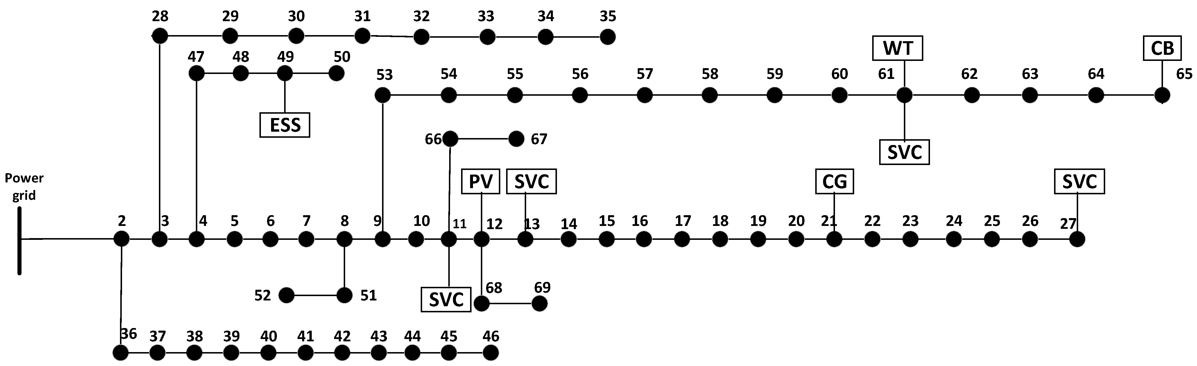 - Grid Reconfiguration: From a structural perspective, altering the operational configuration of the power grid by changing switch states (closing or opening loops) to optimize power flow distribution and voltage levels.