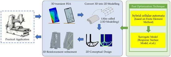 The effect of dynamic loads on structural design has always been an important issue in press design. The typical load of forging and stamping machines is a continuously cycling impact load that depends on the process of the part, and the load frequency is much lower than the natural frequency of the structure, but generally higher than the dynamic energy dissipation frequency of the structure. However, standard press machine design theories and methods rarely consider the comprehensive effect of complex working conditions on the structural design, often focusing only on static stiffness for numerical analysis and design of the structure [22,23]. This comprehensive design process directly leads to design schemes that may be insufficient in stiffness or wasteful in terms of materials in practical use. As early as the 1990s, many scholars identified this phenomenon and conducted related research. For example, Nagamatsu [24] established a discrete model of 32 components for an open C-type press and used dynamic simulation analysis to optimize the design of the configuration. In the further development of press topology optimization, Son [25] proposed a structural design for hot forging presses based on impact control methods. Yan [26] proposed a buffer structure design for stamping presses to reduce the impact of impact loads on machine dynamics and noise. Inspired by the functional adaptation process of bones, Tovar [27,28] proposed the hybrid cellular automata (HCA) method. Its core idea is to combine the local evolution rules of cellular automata with the structural analysis capability of Finite Element Analysis (FEA) and iteratively adjust the material distribution through distributed control cycles to achieve the optimal configuration of the structure. This method has been demonstrated to be an effective approach for transient dynamic stiffness optimization of structures. In recent years, this approach has been successfully applied to the transient dynamic impact stiffness single-objective optimization design of automotive whole vehicles [29,30]. The HCA method has been successfully applied to the transient dynamic impact stiffness single-objective optimization design of vehicles, local parts, and other structures [31]. It can be anticipated that by introducing the HCA method and integrating advanced structural topology optimization design techniques with advanced manufacturing technologies for high-precision hot forging presses, the development of structure optimization theories and design methods aimed at high-precision machine tools will aid in understanding the transient dynamic response characteristics of hot forging presses and achieve transient dynamic stiffness optimization design for these presses.