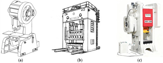Presses can be classified into two main categories: open-back and closed-back. This classification is based on the frame structure, as illustrated in Figure 3a,b. Open-back presses typically feature a C-type frame, which is susceptible to corner deformation and exhibits relatively poor rigidity. However, they are advantageous in terms of operational convenience and equipment maintenance. Closed-back presses employ a rigid frame structure to reduce deformation during operation, thereby enhancing processing precision, which However, comes at the expense of operational and maintenance convenience. The main research object of this paper is the JH31-250 press, as shown in Figure 3c. This model of press has a closed integral frame structure, which is convenient for assembly, has good vibration absorption, and is more suitable for mass production. The frame is mainly composed of four major structures: two distinct walls that support structures, the upper crossbeam, the lower base, and the worktable.