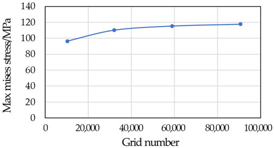 The dynamic performance of the machine tool under forging force impact analysis can be obtained from either time-domain or frequency-domain analysis methods. The numerical methods employed for time-domain transient dynamic analysis can be broadly classified into two categories: implicit algorithms and explicit algorithms. In comparison, implicit methods have stable errors but poor algorithmic convergence. Explicit dynamic analysis algorithms are relatively simple to implement and do not have significant convergence issues. They are therefore widely applicable to transient response analysis of structures, highly nonlinear quasi-static analysis, and other short-term dynamic problems such as blasting, collisions, and contacts. The utilization of explicit dynamic finite element methods for the simulation of the transient impact process of the machine tool allows for the specification of the corresponding working loads through the aforementioned pressure curve, thereby enabling the simulation of the internal force conditions of the press under real working conditions. In structural analysis, the significant mass of the machine frame necessitates the consideration of the effect of gravity, which must also be simulated in a gravitational environment. A mesh sensitivity analysis ensured convergence, with element sizes chosen to balance accuracy and computational cost, as shown in Figure 6.