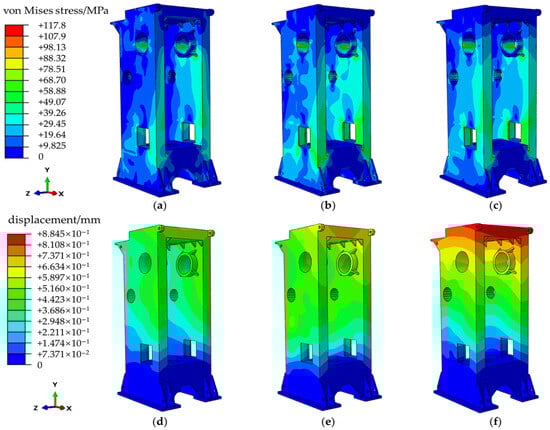 In transient dynamic analysis, the time step of 0.11 s is divided into 20 frames of equal duration, and contour maps of equivalent stress and deformation are plotted. As illustrated in Figure 7 (during work, 3 frames are selected for illustration), the scale of the images is based on the maximum equivalent stress and deformation values experienced by the model under a load. From the contours, it can be observed that the stress distribution in the press machine’s frame is symmetrical on both sides under the transient forces. The stress in the frame is primarily concentrated around the crankshaft hole, the front end of the frame, and the front of the square hole, with fluctuations occurring in these areas. The maximum equivalent stress experienced by the frame during the variation process is 117.80 MPa. As a consequence of the load, the frame undergoes elastic deformation, with deformation displacement evident in the areas above the square hole. The upper end of the crankshaft hole exhibits a larger displacement, and the maximum overall displacement of the frame reaches 0.8845 mm, which has a considerable impact on the rigidity of the frame.
