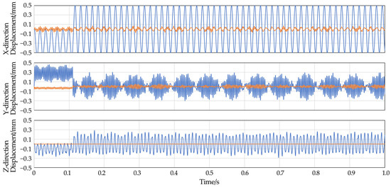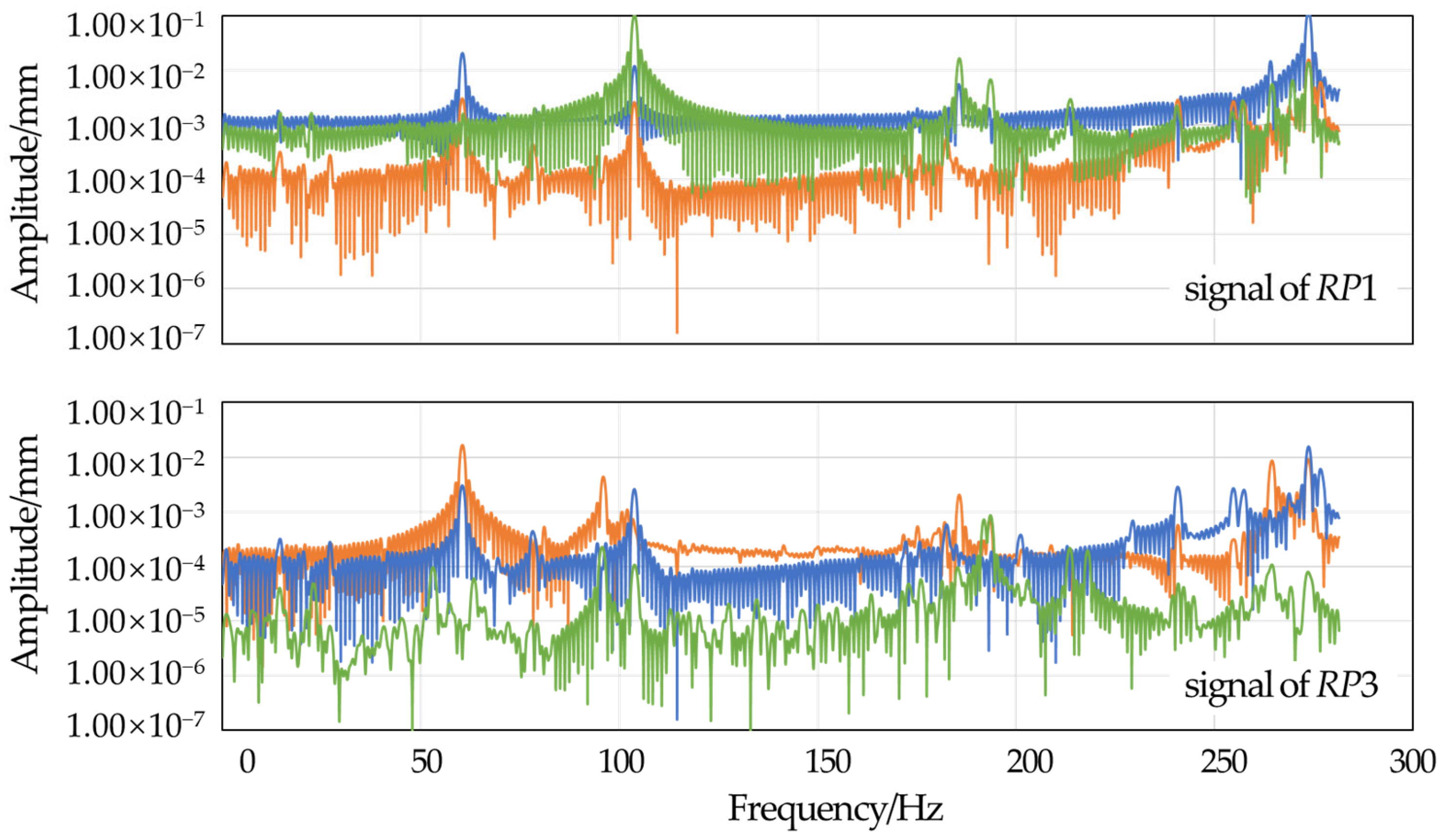 The press machine’s slide travels at a certain speed. This equates to 32 cycles per minute, which means that the actual working frequency of the press machine is 0.53 Hz. The first-order natural frequency of the press machine frame is approximately 22.21 Hz, which means that the low-order natural frequencies of the frame are significantly higher than the frequency of the external excitation sources. This prevents resonance from occurring. The motor utilized in this press machine is a four-pole three-phase asynchronous motor with a rated speed of 1000 revolutions per minute, which indicates that the working frequency of the motor is less than 16.67 Hz. In addition, this motor would be expected to have excitations at 16 Hz, 32 Hz, 48 Hz, and 64 Hz (higher-order harmonics of the electrical machine). However, the severity of resonance depends not only on frequency matching but also, more importantly, on the amplitude of the excitation source.