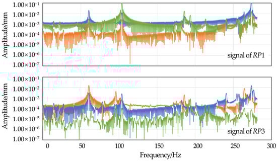 Amplitude of RP1 and RP3 in frequency domain (x-direction: orange, y-direction: blue, z-direction: green).