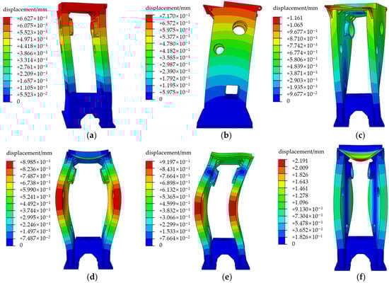 In the study of the steady-state dynamic performance of machine tools, the structural modes and mode shapes are observed. Given that potential dynamic damage to the frame is likely to be concentrated in the low-order modal resonance, the first six natural frequencies are extracted for analysis. The results can be found in Table 3.