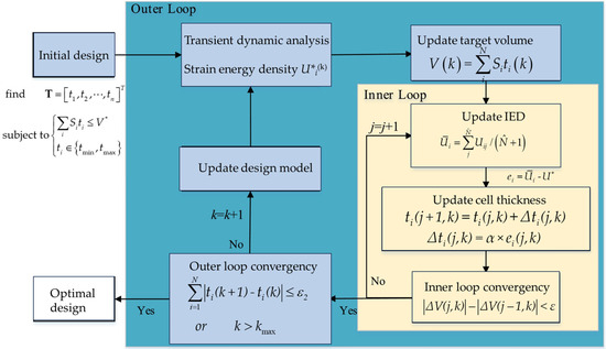 In the formula, the variable ti represents the thickness of the i-th element, Si represents the area of the i-th element. V* is the target volume of the structure to be optimized. The average strain energy density target value in the design domain is defined as U*, and the strain energy density values within N cells are extracted as Ui. Then, we can get the following equation: