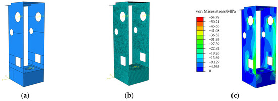 In order to ensure good field contour, the JH31-250 press has been meshed with ten-node bilinear tetrahedral elements, with a size of 50 mm. In the process of mesh division, it is essential to adhere to the following principles [36]: (1) For smaller structures, such as filets, chamfers, and threaded holes, distorted meshes are likely to occur and should be eliminated as much as possible. (2) If the removed structural parts are located in areas of stress concentration, they cannot be simply disregarded and require further mesh division to ensure a more gradual transition with the surrounding meshes. The outcome of the frame meshing is illustrated in Figure 4b, resulting in a total of 90,633 elements and 169,521 nodes.