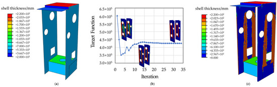 Thickness contour of shell model of the press machine under transient topology optimization: (a) Thickness distribution of original shell model; (b) Topology optimal iteration at design domain; (c) Thickness distribution of topology optimized model. Note: The color scale represents the thickness of the reinforcement material in the design domain. The blue areas (with a thickness value of 8 mm) indicate regions where the reinforcement is removed, leaving only the constant-thickness outer skin of the frame. The red areas represent solid reinforcement material.