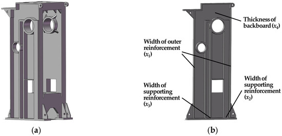 The nonlinear structural optimization iteration process for the machine frame often necessitates intricate calculations and protracted iteration times, which are inimical to both research and application. It is thus imperative to consider more efficacious numerical methods. Optimization strategies of response surface can efficiently approximate the objective function and thus are widely employed in structural size optimization. In this method, the geometric size parameters of the regularized ribbed plate structure are first parameterized, as illustrated in Figure 16b. The design variable P1 represents the side rib of the machine frame design domain, with width X1; P2 denotes the rib on the right side of the square hole, with width X2; P3 is the rib on the left side. The front and back panels of the machine frame, with thickness X4, are represented by the P4 unit. To ensure that the structural volume in the design domain remains unchanged, the plate thickness X4 is set as a passive variable. The relative deformation displacement between the spatial nodes RP1 and RP3 of the machine frame is chosen as the target variable for the response surface design.