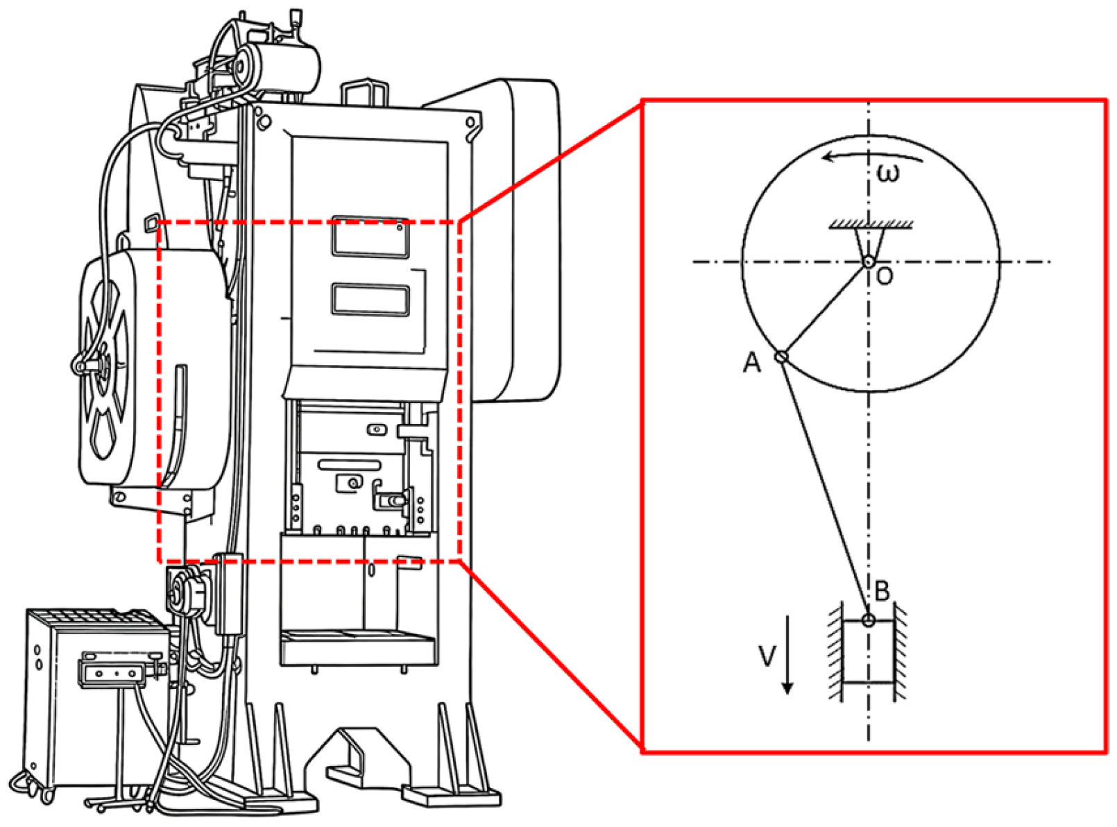 In this context, Point O represents the center of rotation of the crankshaft, Point A represents the connection point between the crankshaft and the connecting rod, Point B represents the connection point between the connecting rod and the slide block, OA is the crankshaft radius, and AB is the length of the connecting rod. When OA rotates at an angular velocity of ω, the slide block performs reciprocating linear motion up and down at a velocity of v.