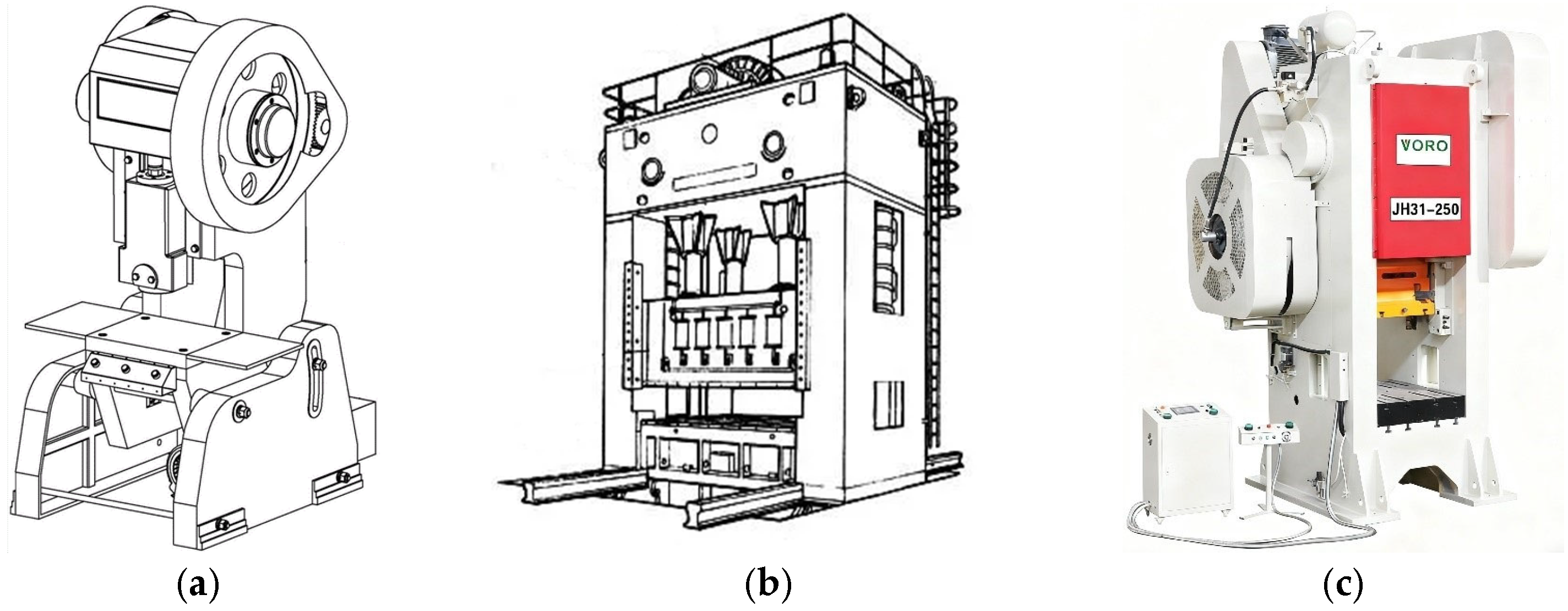 Figure 3a,b. Open-back presses typically feature a C-type frame, which is susceptible to corner deformation and exhibits relatively poor rigidity. However, they are advantageous in terms of operational convenience and equipment maintenance. Closed-back presses employ a rigid frame structure to reduce deformation during operation, thereby enhancing processing precision, which However, comes at the expense of operational and maintenance convenience. The main research object of this paper is the JH31-250 press, as shown in