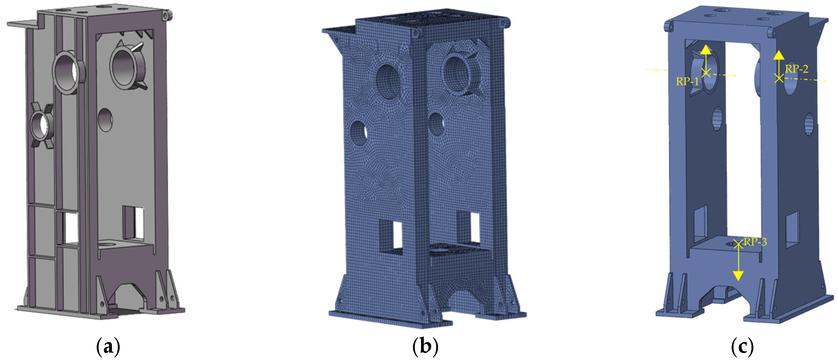 Figure 14b, with a mesh size of 30 mm, resulting in a total of 12,128 mesh elements and 12,722 nodes. In order to enhance the computational accuracy, element performance, and efficiency of the machine frame shell model, it is decided that the quadrilateral reduced integration element is selected. In the field of structural finite element analysis, the quadrilateral reduced integration element is a versatile shell element type with good applicability. When compared to triangular elements, quadrilaterals utilize bilinear interpolation functions, which facilitate enhanced computational accuracy. Furthermore, quadrilateral meshes can incorporate a range of distinctive element algorithms, including reduced integration, assumed strain, and diverse non-conforming algorithms, to augment precision and computational efficiency. The stress analysis result is presented in