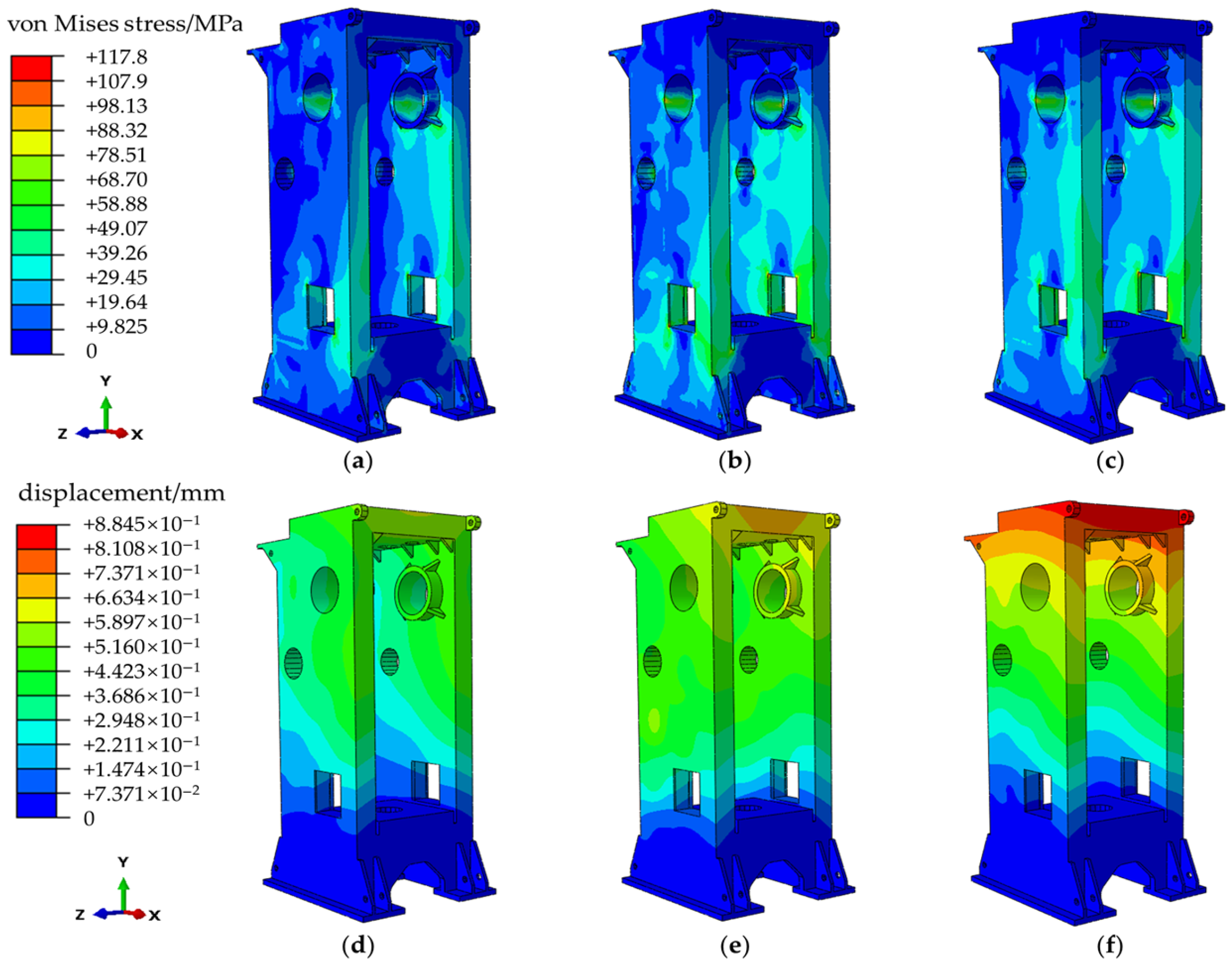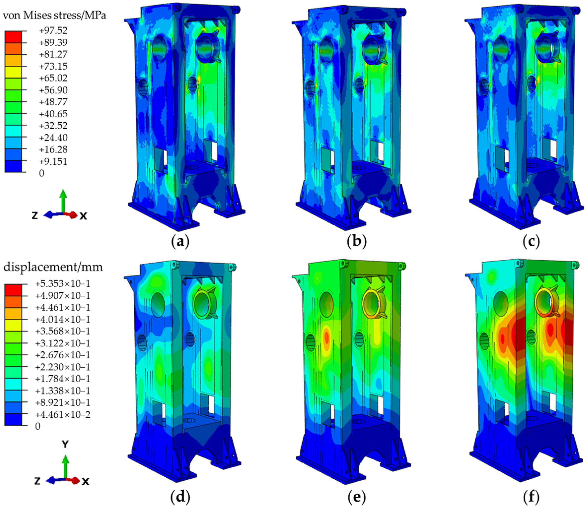 Figure 7 (during work, 3 frames are selected for illustration), the scale of the images is based on the maximum equivalent stress and deformation values experienced by the model under a load. From the contours, it can be observed that the stress distribution in the press machine’s frame is symmetrical on both sides under the transient forces. The stress in the frame is primarily concentrated around the crankshaft hole, the front end of the frame, and the front of the square hole, with fluctuations occurring in these areas. The maximum equivalent stress experienced by the frame during the variation process is 117.80 MPa. As a consequence of the load, the frame undergoes elastic deformation, with deformation displacement evident in the areas above the square hole. The upper end of the crankshaft hole exhibits a larger displacement, and the maximum overall displacement of the frame reaches 0.8845 mm, which has a considerable impact on the rigidity of the frame.