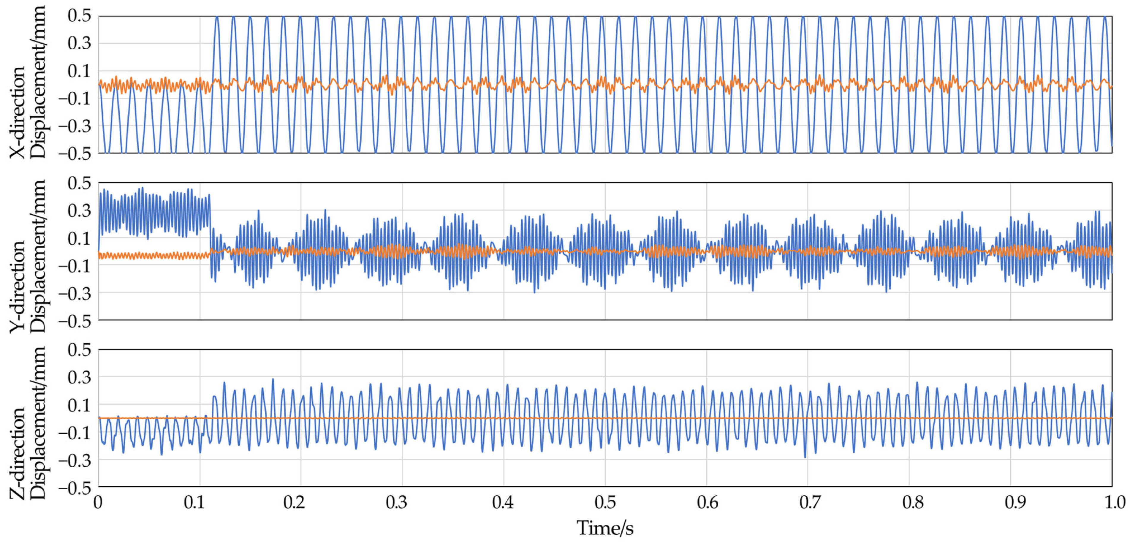 The press machine generates forces that are largely borne by the frame, leading to certain deformations at work. The relative displacement between the crankshaft support hole of the frame and the worktable can cause damage to the dies and even affect product precision. Therefore, the relative deformation between these two locations is used as a criterion for judging the rigidity of the frame. It is also necessary to consider the effect of internal structural damping. From the displacement curve diagram, it can be observed that under the action of transient impact forces, the frame undergoes severe vibration. During the nominal pressure phase, the frame deforms due to the load, and the displacement fluctuates around this value. In other phases, the displacement fluctuates around zero. Considering that the load cycle is much longer than the natural vibration cycle of the structure, high-frequency oscillations can be observed superimposed on the low-frequency loading waveform. Due to the differing modal characteristics in various directions and the varying propagation speeds of stress waves, the overall waveform exhibits a Lissajous phenomenon over an extended period. A comparison of the relative displacement values of nodes RP1 and RP3 during the two phases reveals that the maximum displacement occurs during the nominal pressure load phase.