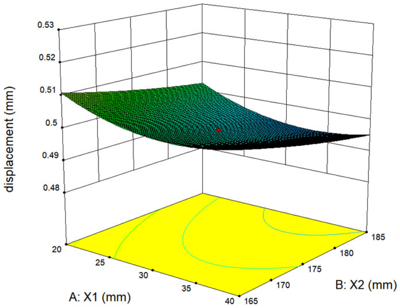 Table 5. This process yields the objective function as a second-order polynomial response surface mathematical model for the maximum relative displacement of the frame, as illustrated by the following formula.
