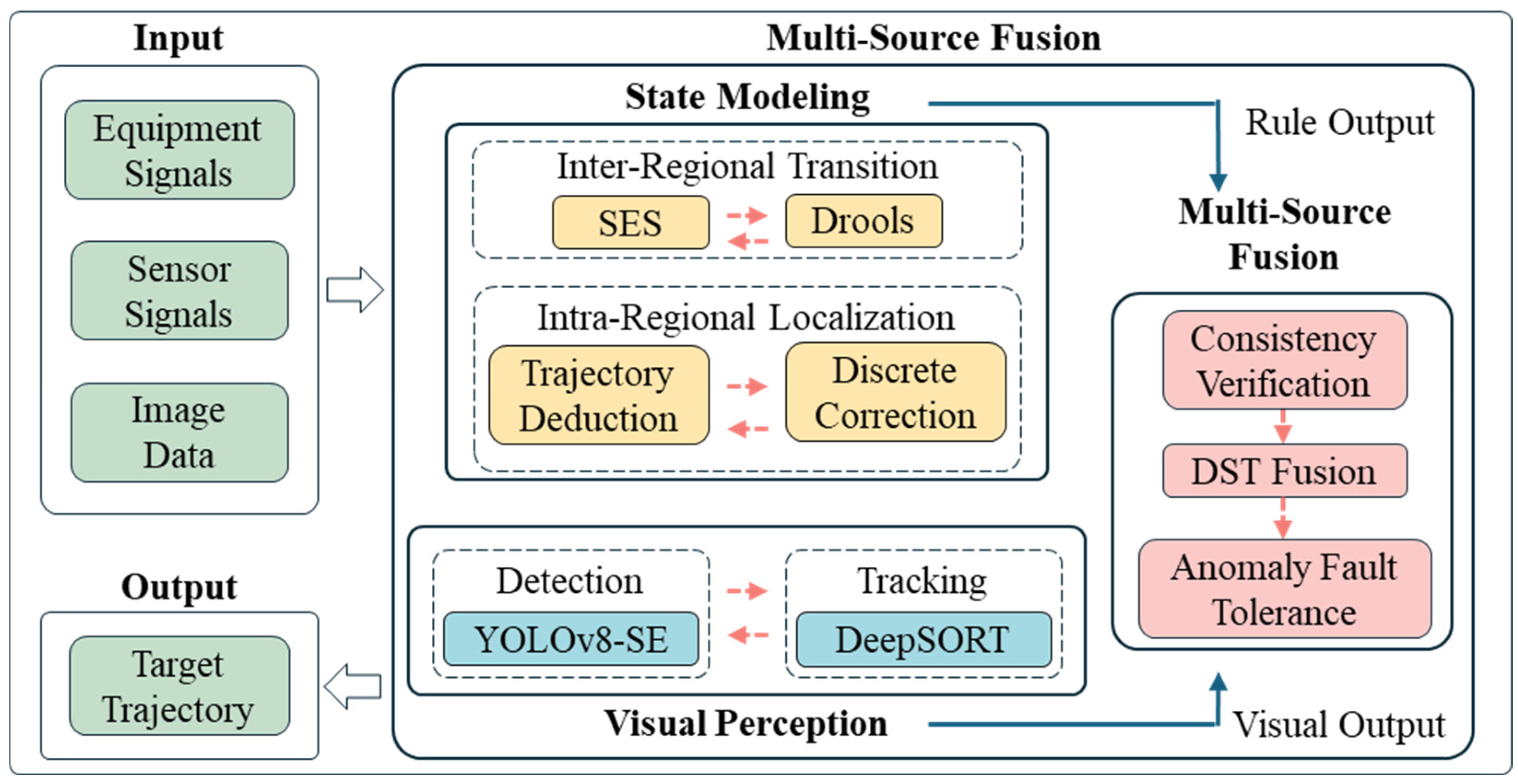 - Multi-source fusion layer: through improved D-S evidence theory, incorporates dynamic confidence, spatiotemporal alignment, and consistency voting mechanisms to integrate visual, signal, and anchor data from multiple sources, enhancing system robustness.
