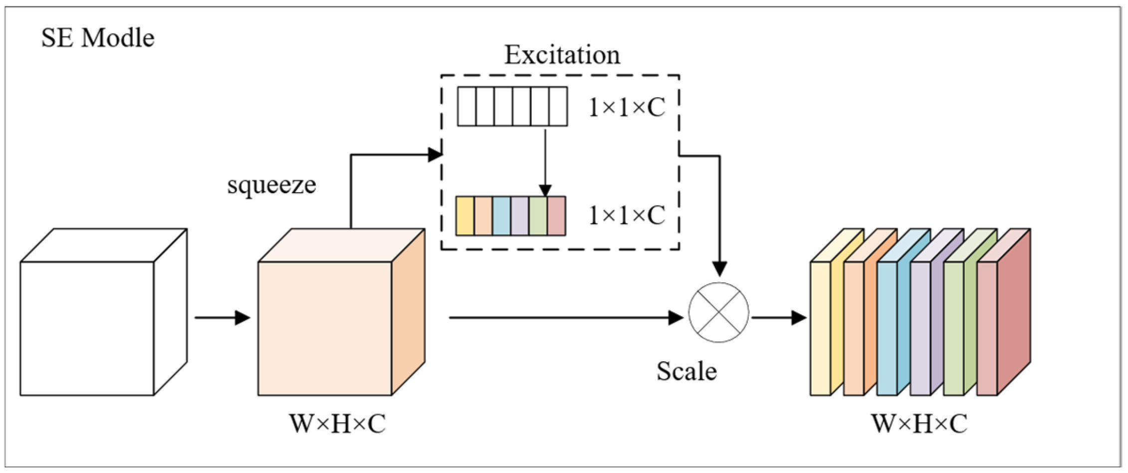 - Feature enhancement (Scale): multiplies learned weights with the original feature map channel-wise to generate enhanced features:where is the original feature map’s c-th channel, and is the enhanced feature channel.