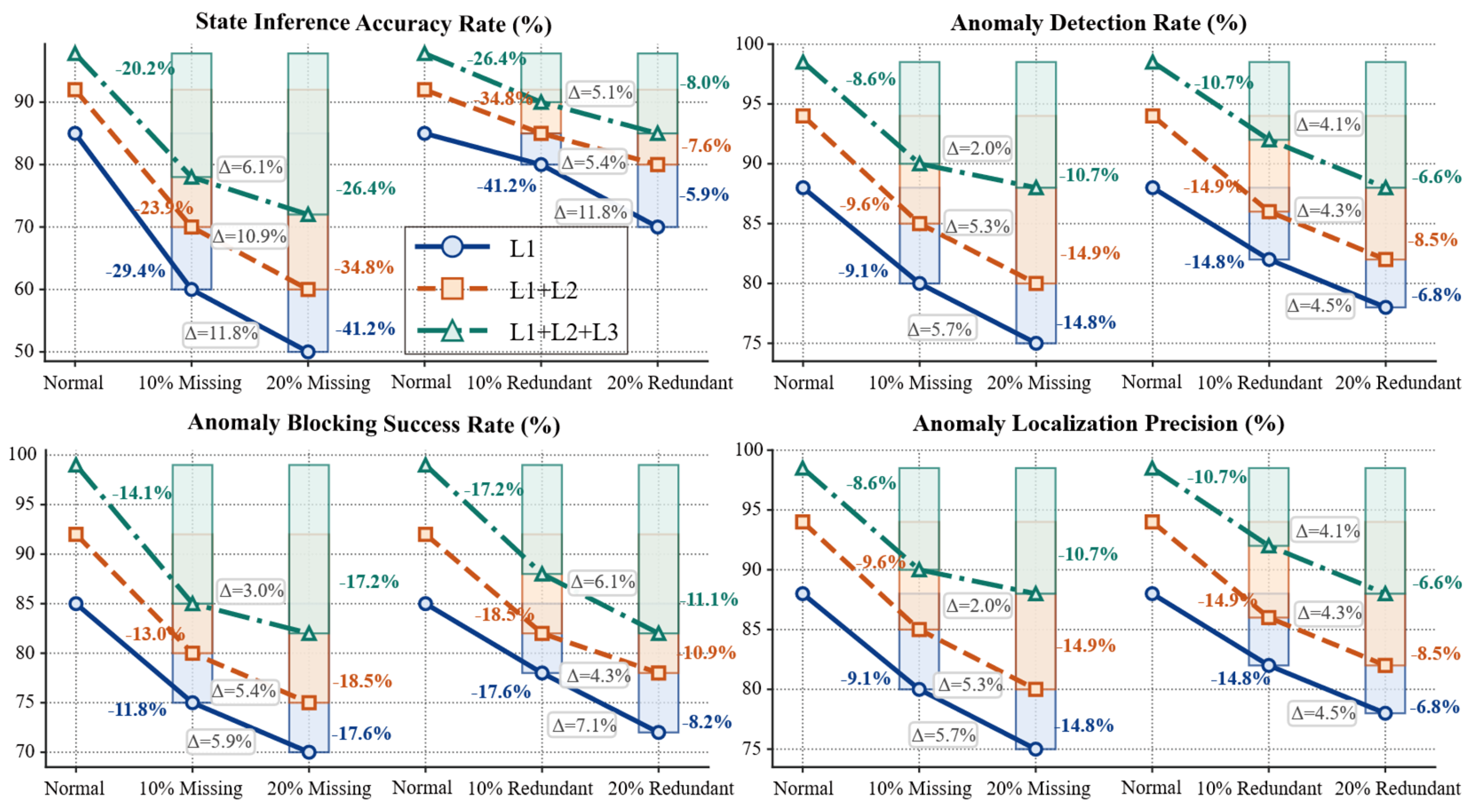 - In scenarios with data missing or redundancy, the performance of all models decreases, but the three-layer model exhibits significantly stronger robustness. In the data redundancy scenario, the three-layer model achieves a BSR of 88.0% (10% higher than L1) and an ALP of 88.0% (10% higher than L1), with a smaller performance attenuation difference (Δ). This demonstrates that the interlock/anti-redundancy logic and causal chain reasoning of the high-level constraint layer can effectively suppress interference and reduce the rate of performance attenuation.
