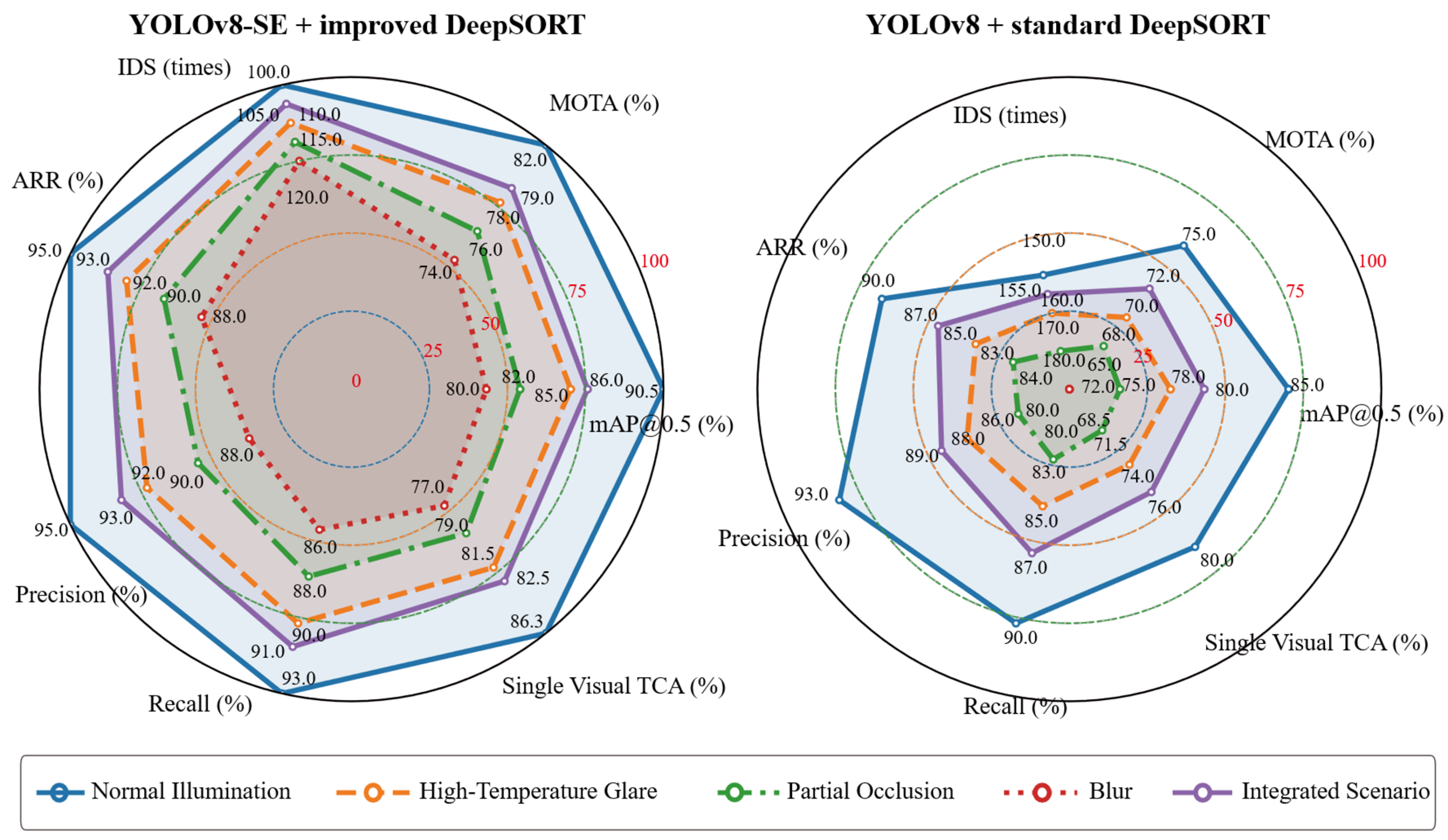 - The “YOLOv8-SE + improved DeepSORT” combination exhibits significant advantages in the normal illumination scenario: mean average precision (mAP@0.5) reaches 90.5% (5.5% higher than the “original YOLOv8 + standard DeepSORT” combination), multiple object tracking accuracy (MOTA) 82.0% (7.0% higher than YOLOv8), and IDS is reduced by 33.3%. This reflects the enhancement effect of the squeeze-and-excitation (SE) module on key features.