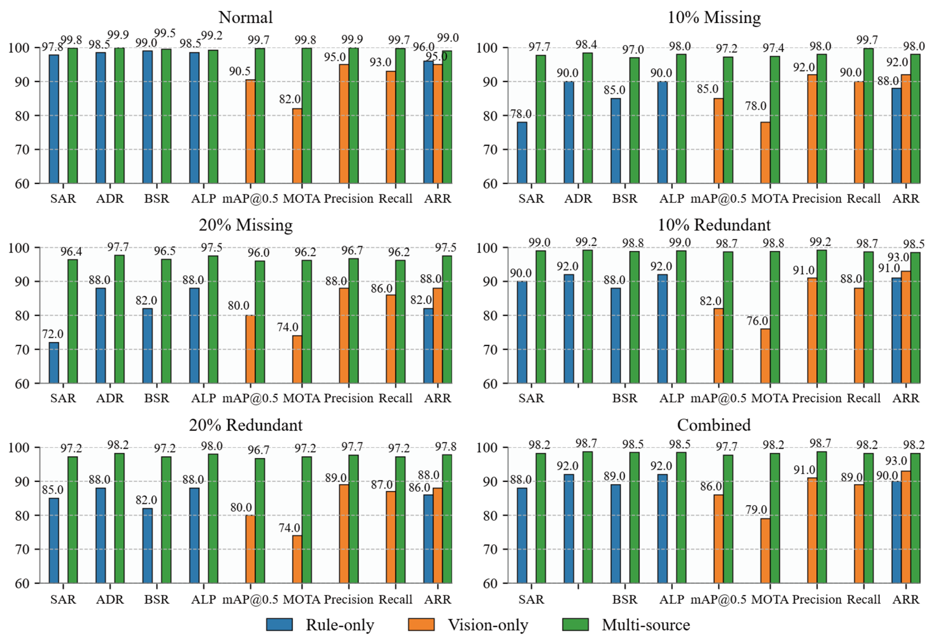 - In the normal scenario without data interference, the multi-source fusion method outperforms single-mode baselines in all indicators. Rule-based inference dimension: SAR reaches 99.8% (2.0% higher than rule-only), and ADR 99.9% (1.4% higher than rule-only), benefiting from the correction of rule ambiguity by visual data. Visual perception dimension: mAP@0.5 reaches 99.7% (9.2% higher than vision-only), and MOTA 99.8% (17.8% higher than vision-only), due to the filtering of visual false detections by rule constraints. Comprehensive recovery dimension: association recovery rate (ARR) reaches 99.0% (3–4% higher than both baselines), reflecting the advantage of “rule-visual” bidirectional verification.