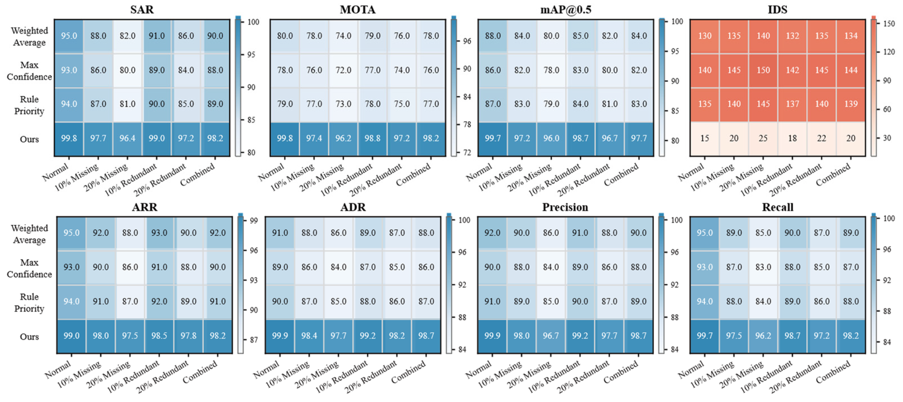 - Our strategy achieves the best performance across all indicators: In the normal scenario, our strategy reaches SAR = 99.8% (4.8% higher than the second-best rule priority) and ADR = 99.9% (8.9% higher than the second-best weighted average), benefiting from the “dynamic confidence weighting + spatiotemporal alignment” mechanism to correct rule ambiguity. With under 20% data redundancy, our strategy achieves mAP@0.5 = 96.7% (11.7% higher than max confidence) and MOTA = 97.2% (18.2% higher than weighted average), as the optimized dynamic matching strategy of DeepSORT enhances ID persistence for similar materials.