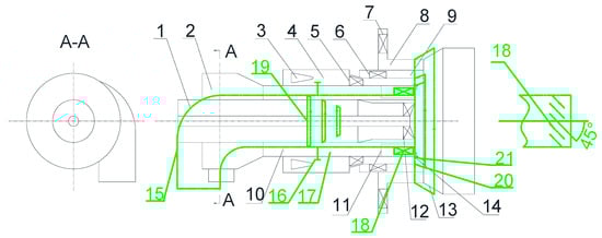 LNASB burner and schematic diagram of advanced flame-stabilized burner structure: (1) central air duct; (2) coal conveying elbow; (3) inner secondary air inlet; (4) inner secondary air passage; (5) inner swirler vanes; (6) tertiary air vanes; (7) outer swirler vanes; (8) outer secondary air passage; (9) tertiary air duct; (10) primary air duct; (11) coal collector; (12) central air swirler; (13) outer air diffuser; (14) flame stabilization ring; (15) modified primary air duct; (16) slit air regulating valve; (17) slit air passage; (18) slit air swirl vanes; (19) triple-stage concentration ring; (20) inner secondary air diffuser; (21) slit air diffuser.