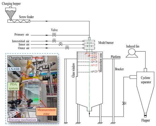 Figure 3 illustrates the spatial distribution of measurement points employed in the experimental study. The characteristic dimension d denotes the inner diameter (0.146 m) of the outer secondary air divergent opening of the model burner. The axial distance from any measurement point to the burner outlet section is defined as x, while the radial distance to the burner central axis is designated as r. In the immediate vicinity of the burner nozzle, intense mixing of airflow streams occurs post ejection, leading to considerable fluctuations in both gas velocity and particle mass flux within this region. To enable a more precise analysis of the gas particle two-phase flow characteristics at the burner exit, a higher density of measurement points with reduced spacing was deployed near the nozzle. Furthermore, to mitigate potential interference from wall or optical edge effects on laser-based measurement accuracy, the initial measurement section was established at a normalized distance of x/d = 0.1. A total of seven measurement sections were arranged along the burner’s central axis at specific dimensionless locations: x/d = 0.1, 0.3, 0.5, 0.7, 1.0, 1.5, and 2.0. Within each cross-section, 36 measurement points were systematically distributed along the radial direction, culminating in a comprehensive total of 252 discrete measurement locations across the experimental domain.