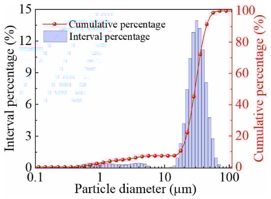 Figure 3 illustrates the schematic layout and measurement point distribution of the gas–particle two-phase cold-flow experimental system. The setup comprises an induced draft fan, a cyclone separator, a Phase Doppler Anemometer (PDA), a screw feeder, a scaled model burner, a correspondingly scaled furnace section, and interconnecting piping. The induced draft fan establishes a negative-pressure (−50Pa) environment within the furnace model, drawing air streams from each supply duct into the chamber. Air mass flow rates are regulated by adjusting ball valves, while U-tube manometers installed on each air supply line enable the determination of actual flow rates via pressure reading conversions. The screw feeder introduces glass beads into the primary air pipe, generating a particle-laden airflow that simulates actual pulverized coal transport. To accurately simulate the velocity lag inherent in pneumatic transport of pulverized coal, a gas particle slip coefficient of 0.8 was employed [29]. This setting maintained the particle velocity at 80% of the local air velocity within the primary air duct. A cyclone separator was integrated into the system to capture and recycle the glass beads after their passage through the test section, facilitating their repeated use. The sampling interval of the PDA for each measurement point is 20 s. The number of collected samples is 20,000, and the data represents the average value. The particle size distribution of the beads, shown in Figure 4, ranges from 0.1 to 100 μm with a mean diameter of 50 μm. Hollow beads smaller than 8 μm served as airflow tracers, while particle beads ranging from 8 to 100 μm simulated pulverized coal particles [30]. To maintain accuracy despite the potential loss of finer particles, the bead inventory was replenished periodically based on real-time monitoring of the particle size distribution.