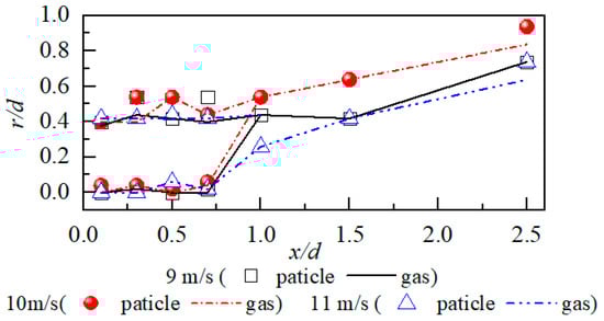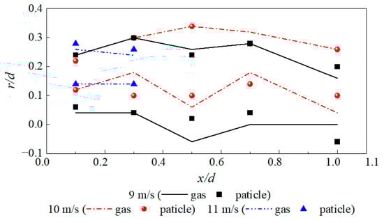 Figure 7 illustrates the radial positions corresponding to the maximum positive axial velocity under varying primary air velocities. At the nozzle cross-section, the axial velocity profile exhibits a bimodal distribution, with peak locations remaining consistent across the different primary air conditions. As the airflow propagates downstream, interaction and mixing occur between flows from distinct air passages. For all three primary air velocities investigated, complete integration of the primary and secondary air streams is observed at the dimensionless axial distance x/d = 1.0, marked by the coalescence of the dual velocity peaks into a single, unified peak, signifying the conclusion of the mixing process. Following mixture completion, the radial position of the resultant peak for the 11 m/s and 9 m/s cases are proximate to each other, yet both are situated significantly farther from the burner centerline compared to the peak position in the 10 m/s scenario. The smallest radial coordinate r for the peak is associated with the highest primary air velocity of 11 m/s. Under this condition, the consolidated velocity peak is not only located closest to the central axis but also demonstrates a greater magnitude relative to the other operational conditions. These findings collectively suggest that an increase in primary air velocity contributes to a longer axial penetration of the mixed airflow, leads to a higher concentration of particles near the centerline, and concurrently regulates the radial dispersion capability of the flow.