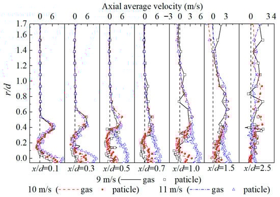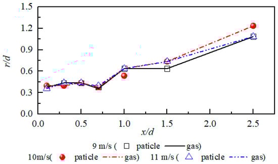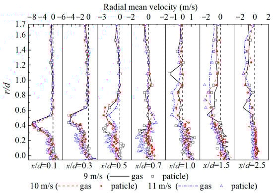 The radial average velocity distribution at the outlet of the novel stable combustion burner under different primary air velocities is shown in Figure 9. Within the range of x/d = 0.1–1.0, significant negative values in the radial average velocity for both gas and particle phases are observed near r/d = 0.35 under different loads, indicating that the two-phase flow moves towards the burner centreline in this region. Combined with Figure 6, it can be seen that the region where negative radial average velocities occur essentially coincides with the recirculation zone, suggesting that the two-phase flow within the recirculation zone exhibits both a tendency to reflux axially and a tendency to converge towards the centerline. During actual boiler operation, the convergence of pulverized coal towards the recirculation zone facilitates its full contact with high-temperature flue gas. Owing to the straight-flow (non-swirling) design of the primary air in the novel stable combustion burner, the radial average velocity near the burner centerline remains relatively low. This velocity exhibits a further decreasing trend as the primary air velocity increases, indicating that a higher primary air momentum constrains the radial diffusion capability of the pulverized coal-laden stream at the outlet. Within the downstream region of x/d = 1.5–2.5, the radial average velocity attenuates to approximately 0 m/s.