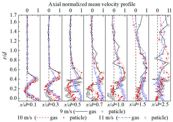The axial normalized mean velocity profiles at the outlet of the novel stable combustion burner under different primary air velocities are shown in Figure 8. The normalized mean velocity is a dimensionless number obtained by dividing the velocity at each point by the maximum positive velocity, facilitating the comparison of relative distribution characteristics. For the novel stable combustion burner, as the primary air velocity increases, the swirl numbers of both the gas phase and the particle phase decrease significantly, which is consistent with the trend shown in Figure 6. Within the range of x/d = 0–0.3, the axial normalized mean velocity under the three primary air velocity conditions exhibits a bimodal distribution. The peak near the burner centerline is caused by the primary air/pulverized coal flow, while the peak away from the center is caused by the secondary air flow. Near r/d = 0.1, the axial normalized mean velocity is negative, indicating the presence of a recirculation zone. As the primary air velocity increases, the normalized peak value of the main peak (caused by the primary air/pulverized coal) increases, while the position and magnitude of the secondary peak (caused by the secondary air) remain essentially unchanged. The starting point of the negative velocity region moves away from the burner centerline, and its range becomes smaller. At the x/d = 0.5–0.7 cross-section, the negative velocity region has disappeared for the case with a primary air velocity of 11 m/s, indicating that for the novel stable combustion burner, selecting a higher primary air velocity causes the central recirculation zone to transition to an annular recirculation zone, and the range of the recirculation zone shrinks. At the x/d = 1.0 cross-section, the radial distribution of the axial normalized mean velocity under different conditions transforms into a single-peak structure. It is worth noting that when the primary air velocity is 11 m/s, the mixed peak is located near the central axis of the burner outlet, and its normalized peak value is more prominent compared to the other conditions. This indicates that when the burner operates under this condition, the axial movement tendency of the airflow in the central region is stronger, and the tendency for outward diffusion is weaker. At the x/d = 1.5–2.5 cross-sections, the differences in the axial normalized mean velocity distribution of the two-phase flow at the burner outlet under different primary air velocities are small; the velocity distribution curves tend to flatten, reflecting a homogenization trend of the flow in the downstream region. Overall, the axial normalized velocity profiles share consistent physical characteristics with the axial absolute velocity distribution, verifying the axial flow characteristics of the burner under different primary air velocities.