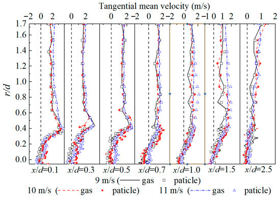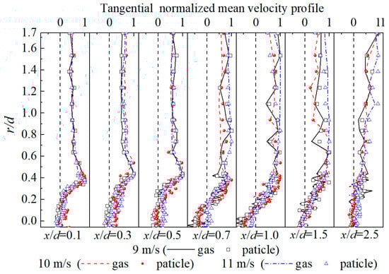 The tangential normalized mean velocity profiles at the outlet of the novel stable combustion burner under different primary air velocities are shown in Figure 12. The shapes of the tangential normalized mean velocity distribution curves under different primary air velocities are similar, consistent with the trend in Figure 10. Outside the burner nozzle, the tangential normalized mean velocity of the two-phase flow exhibits a single-peak distribution along the radial direction, with the peak always located in the swirling secondary air region. Near the nozzle (x/d = 0.1–0.3), the shapes of the tangential normalized mean velocity distribution curves for the two-phase flow under different primary air velocities are basically identical, and their peak positions and magnitudes are also basically the same. Within this range, as the two-phase flow moves away from the nozzle cross-section, the tangential normalized mean velocity does not show a significant decay trend, indicating that the gas particle two-phase flow maintains a relatively stable rotational capability in this area. When the flow develops to x/d = 0.5–1.5, the rotational intensity of the two-phase flow is similar under different primary air velocities. This is because the swirling secondary air plays a dominant role in the tangential velocity distribution, while the direct-flow primary air mainly affects the overall axial movement component of the two-phase flow. It is noteworthy that when the primary air velocity is 10 m/s, the peak value of the tangential normalized mean velocity along the radial direction is the largest, and the two-phase flow exhibits the strongest rotational capability. At x/d = 2.5, the tangential normalized mean velocities of the two-phase flow under different primary air velocities all decay to around zero, reflecting the complete dissipation of rotational momentum in the downstream region. Overall, the tangential normalized mean velocity profiles share consistent physical characteristics with the distribution in Figure 10, verifying the tangential flow characteristics of the burner under different primary air velocities.