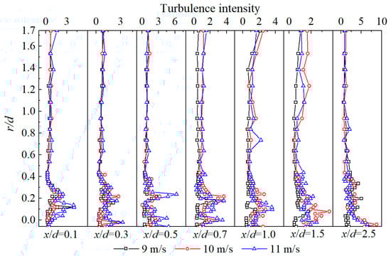 The distribution of turbulence intensity at the outlet of the novel stable combustion burner under different primary air velocities is shown in Figure 13. The turbulence intensity distribution of the airflow at the burner outlet is non-uniform, exhibiting high-level fluctuations within the range of r/d = 0–0.4. It can be observed that within the range of x/d = 0.1–1.0, the region of intense turbulence fluctuation basically coincides with the recirculation zone. The turbulence intensity exhibits a bimodal distribution along the radial direction, with a higher peak located at the burner centerline (r/d = 0.12) with a peak value of 3.5, and a lower peak distributed at the junction area between the primary air and the gap air (r/d = 0.24) with a peak value of 2.1. As the primary air velocity increases, both peaks show an enhancing trend: the higher peak increases from 3.5 to 4.0 (a 14% increase), and the lower peak increases from 2.1 to 2.5 (a 25% increase). The emergence of the aforementioned flow field characteristics stems from two reasons. First, the increase in primary air velocity leads to a greater velocity difference between the primary air and the swirling gap air, significantly enhancing the turbulent perturbation in the shear layer of the airflow. Second, the high-velocity primary air increases the velocity component of particles towards the center, and the increased particle concentration in the centerline region intensifies the particle collision and energy exchange processes. When the two-phase flow develops to x/d = 1.5–2.0, it reaches a position relatively far from the burner nozzle section. The turbulence intensity along the radial direction shows only a single peak near the centerline, whose magnitude is primarily determined by the overall axial velocity component of the airflow. The peak position is at r/d = 0.03, and the peak value is 3.0. As the primary air velocity increases, the turbulence intensity of the two-phase flow in this region increases.