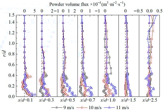 Figure 14 presents the distribution of particle volume flux at the outlet of the novel stable combustion burner under varying primary air velocities. In all operating conditions, the particle volume flux displays a distinct unimodal profile radially. As illustrated by the peak positions across different cross-sections in Figure 15, within the region from x/d = 0.1–0.5, the maximum particle volume flux consistently occurs near the burner centerline. Furthermore, the magnitude of this peak exhibits a positive correlation with increasing primary air velocity. This behavior results from the enhanced centripetal velocity component imparted to pulverized coal particles as they interact with the three-stage concentration rings under the influence of high-velocity, straight-flow primary air, leading to a significant accumulation of particles along the central axis. Concurrently, in the vicinity of r/d = 0.2, the particle volume flux assumes negative values, signaling the presence of a particle reflux phenomenon. A comparative analysis of Figure 5 and Figure 14 confirms that this zone of negative flux aligns spatially with the recirculation zone at the burner outlet. The intensity of the negative peak is directly influenced by the extent of the recirculation zone; for instance, a primary air velocity of 9 m/s yields the most pronounced negative peak, indicating optimal particle entrainment within the recirculation zone under this condition. As the gas particle flow develops further downstream to x/d = 0.5–1.0, an increase in primary air velocity from 9 m/s to 11 m/s leads to a higher particle volume flux near the centerline, accompanied by an accelerated decay rate radially. This pattern suggests that elevated primary air velocity improves particle concentration in the central region while concurrently restraining its radial dispersion. In practical burner operation, the radial diffusion capability of pulverized coal particles is critical for achieving uniform flame distribution and full spatial utilization of the furnace volume. Hence, operational strategies should aim not only to enrich coal concentration centrally but also to preserve an adequate radial diffusion capacity for stable and efficient combustion.
