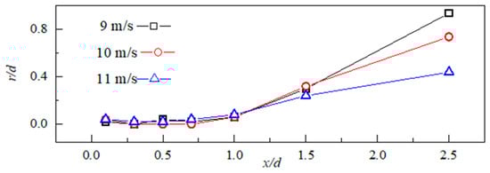 Figure 11 illustrates the radial positions corresponding to the peak positive tangential velocity at the outlet of the novel stable combustion burner across the tested primary air velocities. Within the near-nozzle region (x/d = 0–0.7), the locus of the maximum tangential velocity remains consistent under all conditions, consistently located near r/d = 0.3. Beyond x/d = 0.7, a marked outward migration of the peak tangential velocity position is observed with increasing axial distance, characterized by a rapid increase in its radial coordinate (r/d). This shift occurs because the maximum tangential velocity is predominantly generated within the swirling secondary air flow region, given the straight-flow nature of the primary air. Consequently, as the combined airflow expands radially downstream, the point of peak tangential velocity exhibits a progressively outward trend for all primary air velocities assessed.