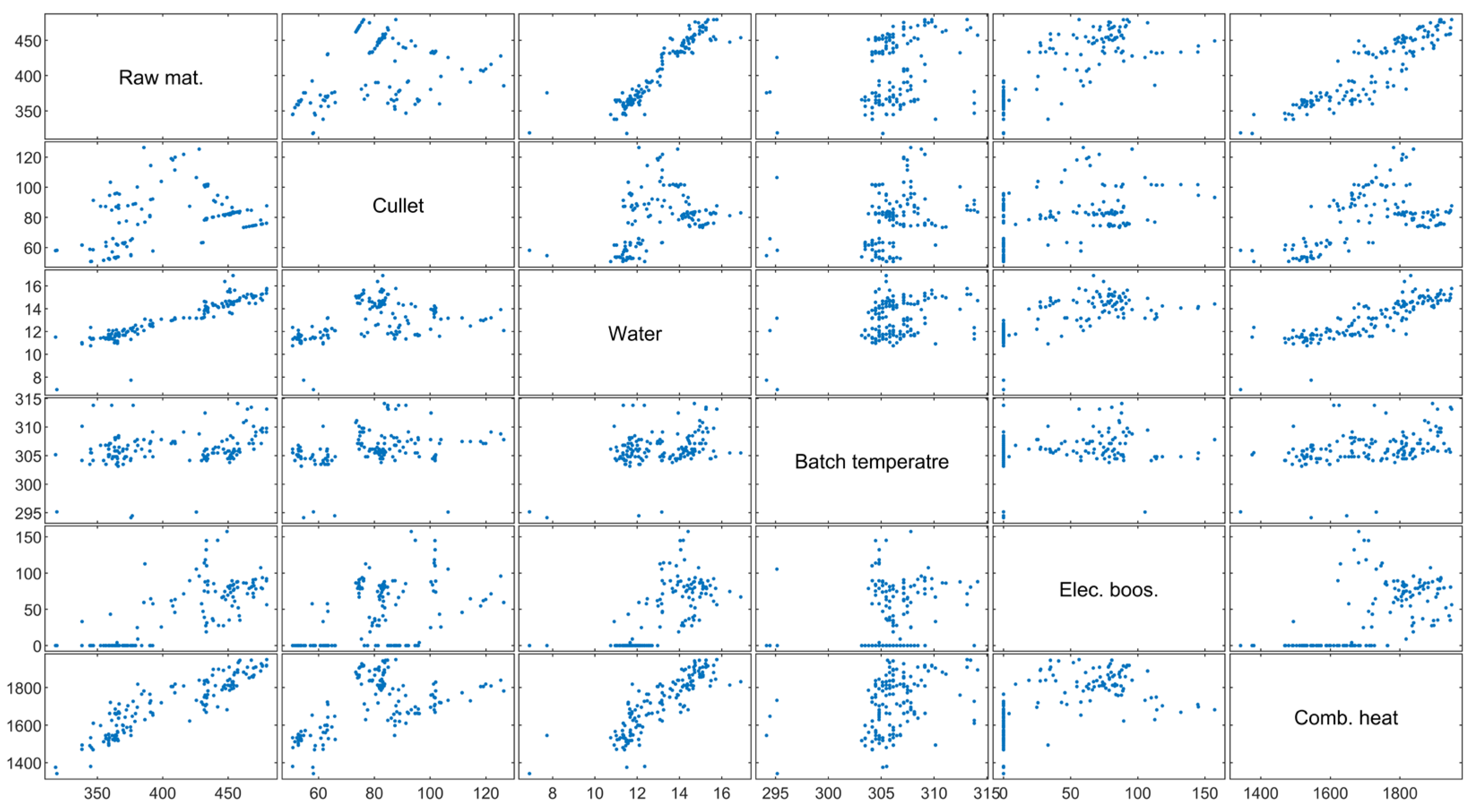 A scatter plot is a graphical tool used to represent the relationship between two quantitative variables. The X-axis corresponds to the independent variable, and the Y-axis corresponds to the dependent variable. Each data point presents an individual observation. Scatter plots are generally used for determining dataset distribution and identifying correlations (positive, negative, or unrelated) between variables. The scatter plot matrix for the variables of raw material, cullet, water, batch temperature, electric boosting, and combustion heat is presented in