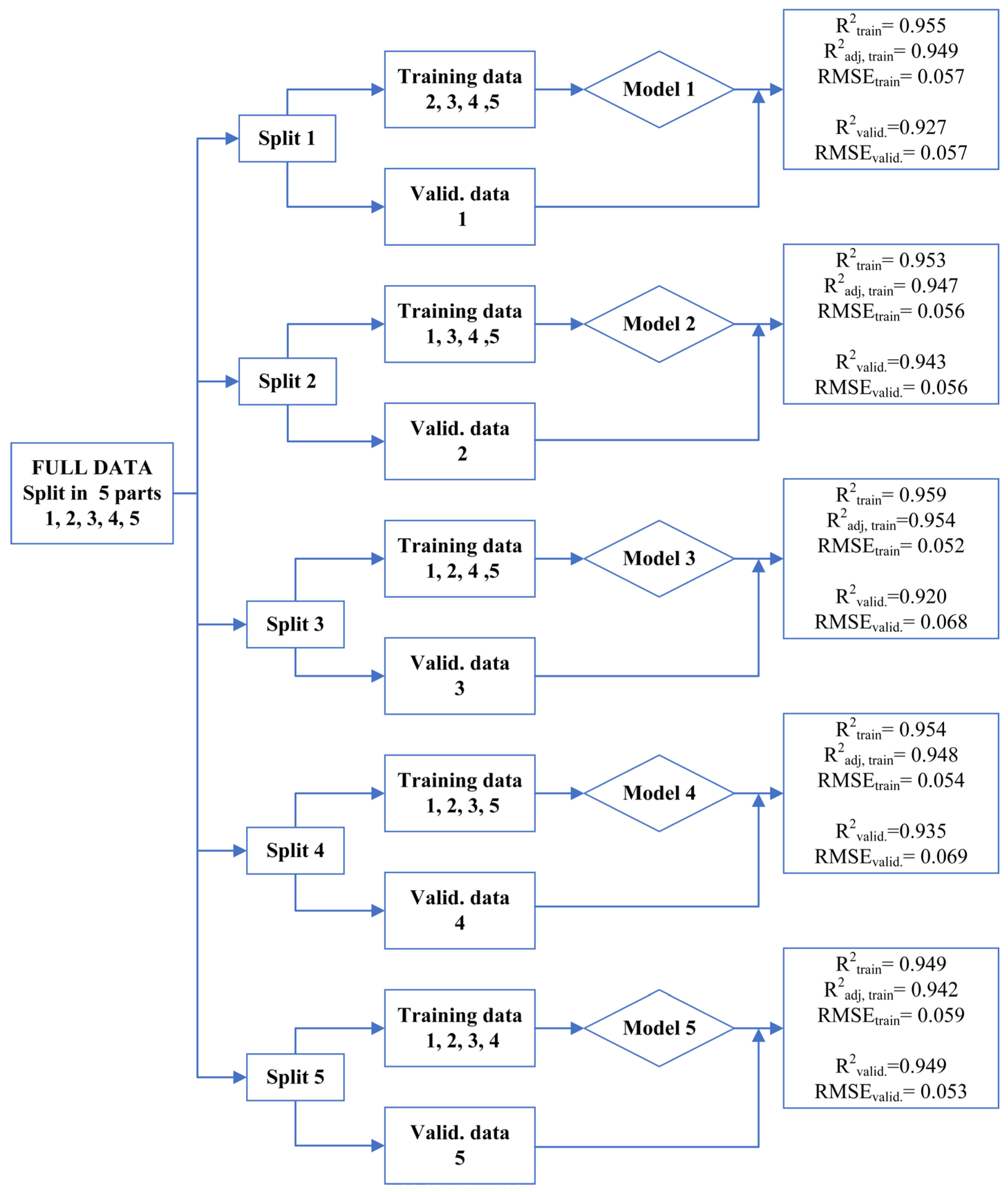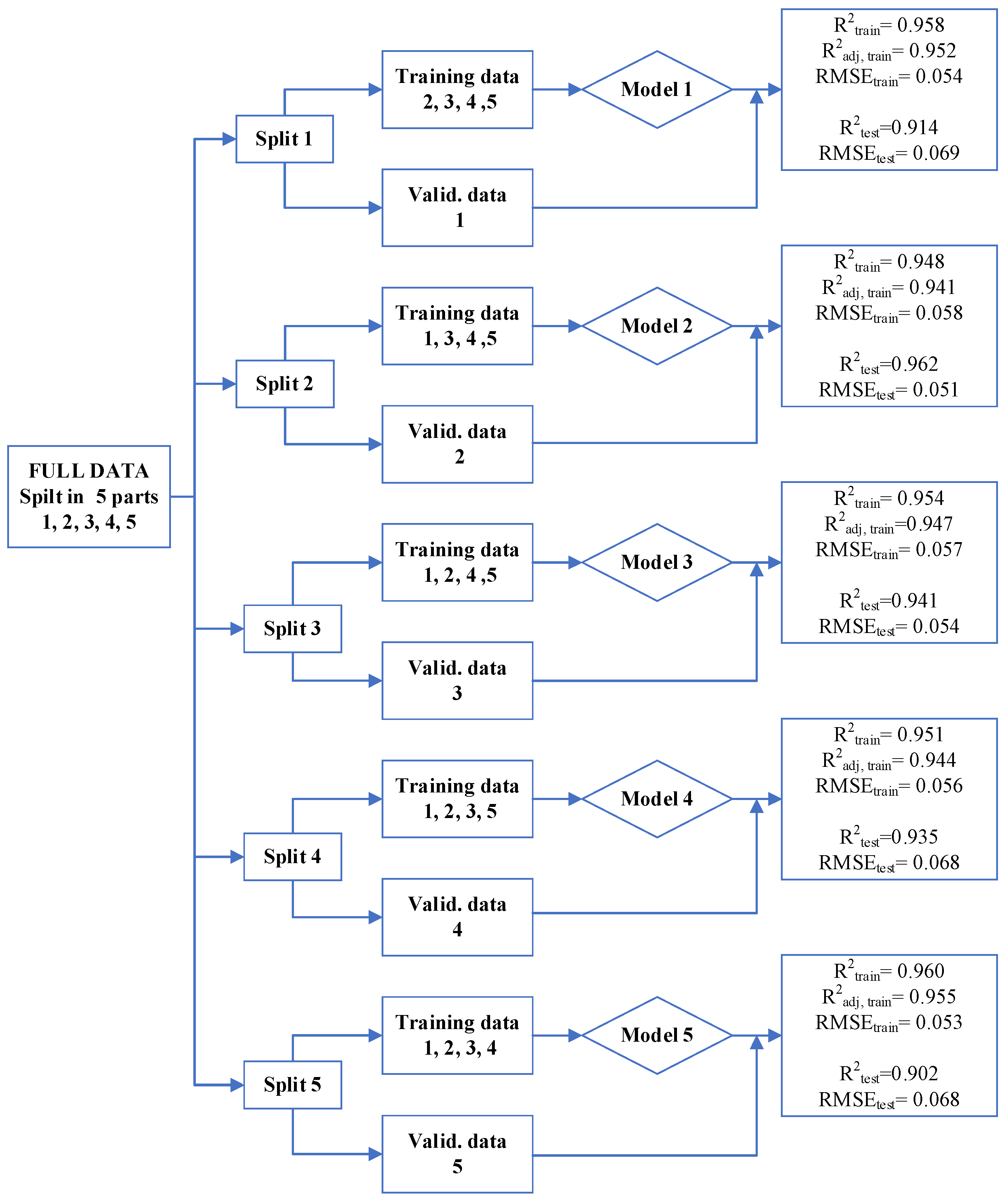 The purpose of the cross-validation technique is to determine whether a model performs consistently on different subsets of the dataset. This approach helps when evaluating the reliability of the data, detecting inconsistencies within the dataset, and mitigating the risk of the overfitting problem. To perform cross-validation, the cross-validation data were divided into five folds. A separate regression model was trained for each fold, and performance metrics including the coefficient of determination (