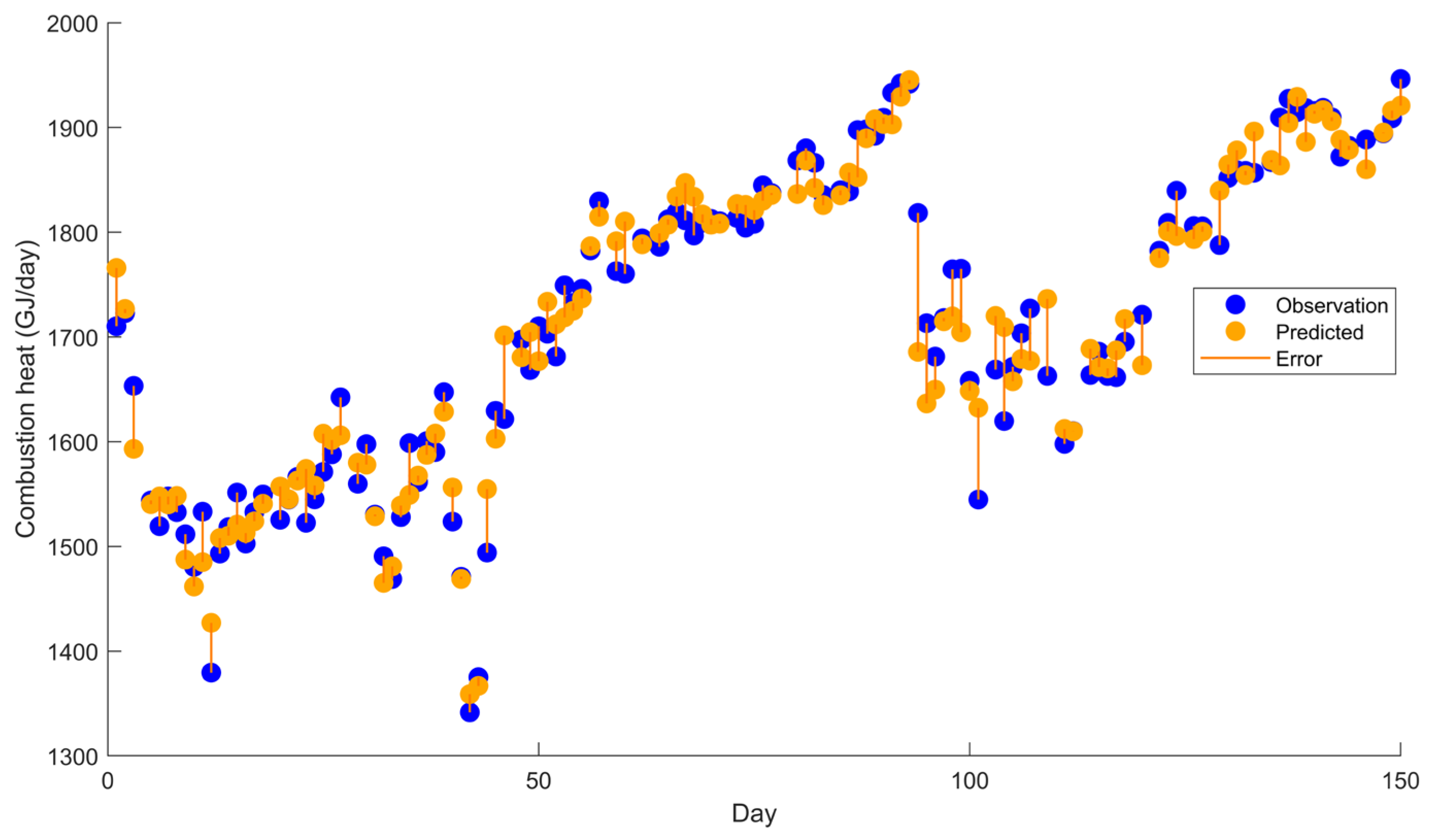Table 8 reports that the relative error in predicting the combustion heat required by the glass furnace ranged from a minimum of 0.106% to a maximum of 2.604%, with the most errors around 1.328% (mean absolute error). The relative error between the actual and predicted combustion heat value may have been caused by a sudden change in daily glass production. If the daily glass production requirement of the furnace had been a little more stable, the value of the relative error that the model would have made may perhaps have been even lower. In addition, accurately knowing the daily combustion heat requirement before production begins allows precise estimation of the amount of natural gas needed from the network and its cost.