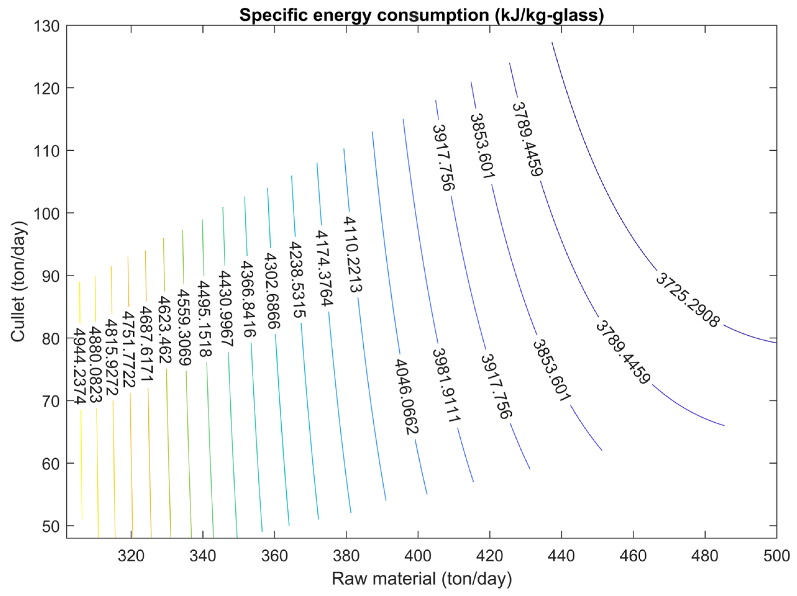 The estimated specific energy consumption as a function of raw material and cullet inputs under this condition is illustrated in
