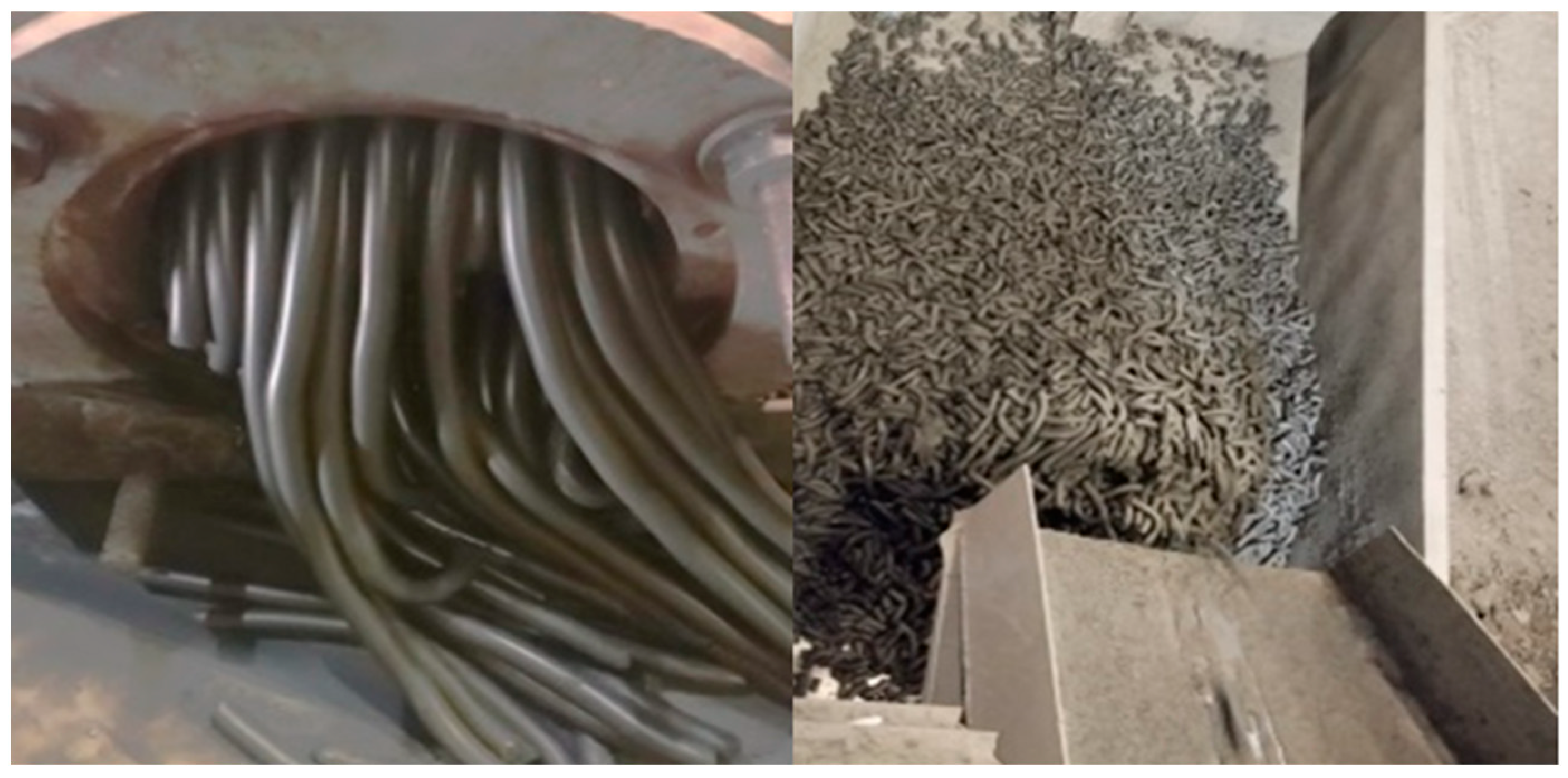 The data in Table 4 show that briquettes with the binder TD 021.005.BS exhibited the highest results across all criteria. It is also noteworthy that, unlike the others, briquettes with this binder are water-resistant. After being immersed in water for one day, the briquettes retained their original shape and did not disintegrate. The plasticizing ability of TD 021.005.BS is also high, resulting in the longest and most plastic briquettes from the extruder, which is advantageous when they drop onto the side of a dump truck from the conveyor and are subsequently discharged in bulk into storage bins (Figure 2). As seen in Figure 2, briquettes with this binder are longer compared to those made with other additives.
