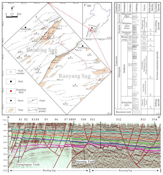 The location of study area (a); the faults and sample wells distribution characteristics in the Baoding–Raoyang Sag (b); a general lithologic column in Baoding Sag (c); and the N-W seismic cross-section with the faulting and stratigraphic layering characteristics (d), the section position is shown in (a).