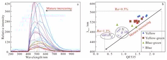 There are four types of fluorescence spectral characteristics, with increasing maturity from Type I to Type IV (Table 2 and Figure 4): Type I: yellow fluorescence, with λmax ranging from 540.9 to 548.9 nm (average 544.2 nm), Q ranging from 0.596 to 0.783 (average 0.704), and QF535 ranging from 1.535 to 1.845 (average 1.701); Type II: yellow-green fluorescence, with λmax ranging from 518.2 to 534.1 nm (average 524.9 nm), Q ranging from 0.518 to 0.652 (average 0.580), and QF535 ranging from 1.256 to 1.667 (average 1.469); Type III: blue-green fluorescence, with λmax ranging from 500.9 to 510.4 nm (average 505.9 nm), Q ranging from 0.231 to 0.548 (average 0.418), and QF535 ranging from 0.780 to 1.463 (average 1.188); Type IV: blue fluorescence, with λmax ranging from 459.7 to 492.2 nm (average 474.3 nm), Q ranging from 0.067 to 0.452 (average 0.282), and QF535 ranging from 0.264 to 1.145 (average 0.763) (Table 2 and Figure 4a).