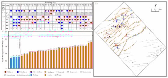 Through statistics, the fault juxtaposition thickness, combined with the distribution characteristics of oil and water, can qualitatively or semi-quantitatively forecast the leakage of the hydrocarbon in the reservoir [28]. In the Baoding Sag, most faults do not break through the caprock, with a fault juxtaposition thickness ranging from 0 to 241 m in the Dongying Formation, while the faults break through the caprock with a fault juxtaposition thickness ranging from −21 to 0 m. According to the distribution characteristics of oil and water in the fault-bound traps, the oil-water interface on the left was obviously higher than the right by around a fault juxtaposition thickness of 86 m (Figure 7a,b). Thus, we set 86 m as the threshold for hydrocarbon leakage in the Dongying Formation to the Guantao Formation; when the fault juxtaposition thicknesses fell below this value, the hydrocarbon would leak. Specifically, we also plotted the oil-gas wells of the Guantao Formation onto the fault–cap sealing distribution map and found that they were mainly distributed at structural high points around a fault juxtaposition thickness of less than 86 m (Figure 7c).