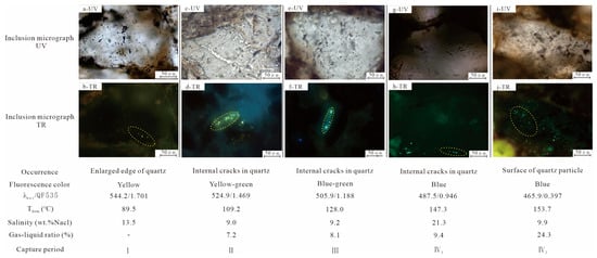 The types, occurrences, fluorescence colors, Thom, salinities, and gas–liquid ratios of fluid inclusions serve as fundamental methods to distinguish and delineate hydrocarbon charging periods [5,26]. When combined with fluorescence spectral parameters, these methods can refine period division, allowing for a rough forecast of maturity characteristics, even among inclusions with identical fluorescence colors [19,37].