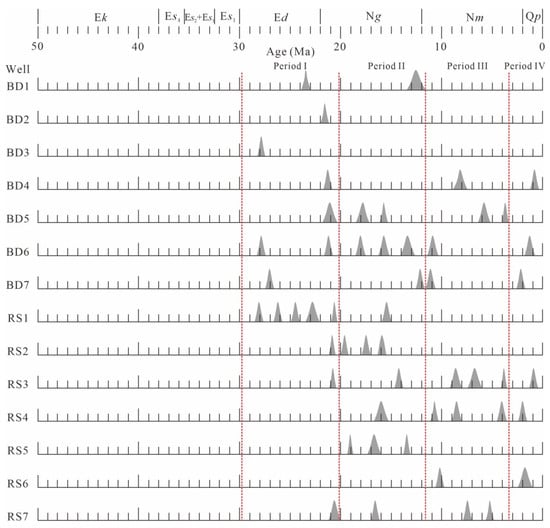 To further determine the hydrocarbon charging times, we reconstructed the burial–thermal history of the wells based on fluid inclusion characteristics, allowing us to approximate the charging ages [38]. Figure 9 illustrates that: period I primarily charged from 20.2 to 29.8 Ma (average 23.0 Ma); period II primarily charged from 11.7 to 20.1 Ma (average 15.9 Ma); period III primarily charged from 3.5 to 11.8 Ma (average 7.9 Ma); period IV primarily charged from 0.3 to 2.4 Ma (average 1.1 Ma). Notably, the charging times for IV1 (0.3–0.7 Ma) and IV2 (0.3–2.4 Ma) are quite similar, but IV1 shows much later; this result aligns with the tectonic and Ro evolution process. The relatively late and overlapping charging times suggest that faults provided communication pathways between the Shahejie source rock and the Dongying reservoir. These faults formed during the Neogene period and were associated with strike-slip movements [24].