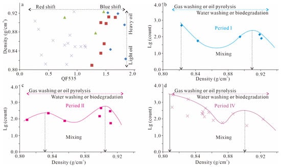 Fluorescence spectral character (QF535 and density) of different hydrocarbon charge stages. (a) is the relation between QF535 and the density of all period samples; (b) is the relation between the frequency and density of period I; (c) is the relation between the frequency and density of period II; (d) is the relation between the frequency and density of period IV. The legend were similar to Figure 4.