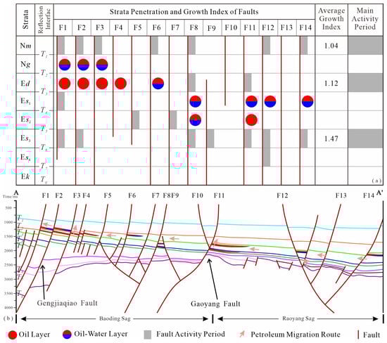 The fault activity time and oil–water distribution character statistics result (a), and petroleum migration route in the reservoir (b). The A–A’ section position is shown in Figure 1b.