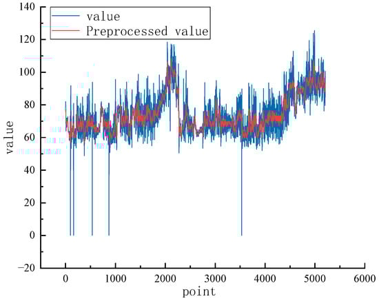 During the update process, the state estimates are corrected by the observed data and predicted state estimates, and new error covariances are recalculated. denotes the Kalman gain, which is used to measure the weight relationship between the predicted values and observed values and gives a modified state estimate based on the predicted states and observed values . Equation (6) denotes the revised error covariance, while the ultimate data preprocessing steps are illustrated in Figure 3. The figure visually demonstrates the effective suppression of high-frequency noise and abnormal data values resulting from the preprocessing procedure described above, with all major dynamic trends and essential features of the initial signal being faithfully preserved. To quantitatively evaluate the effectiveness of the data quality enhancement, we calculated the signal-to-noise ratio (SNR) before and after filtering. The results indicate an SNR of 27.59 dB, confirming the efficacy of the noise reduction process.