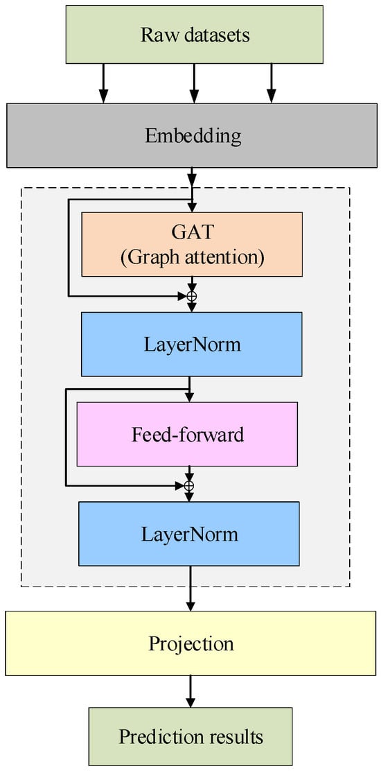 For each connected node , we update the node characteristics as shown in Equation (14), where is the learnable weight matrix, is the activation function, and represents the set of adjacent nodes of node . It is particularly noteworthy that, in the graph attention network employed in this study, the final connection strength between nodes is not a static predefined value but is dynamically computed through the attention mechanism. For any central node, the connection strength with all neighboring nodes is calculated as shown in Equation (15), where represents the final contribution or connection strength of node ’s features to node , and its calculation formula is shown in (15), where is the learnable attention vector, and represents the vector splicing operation.