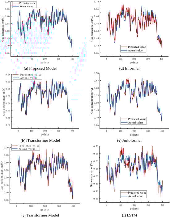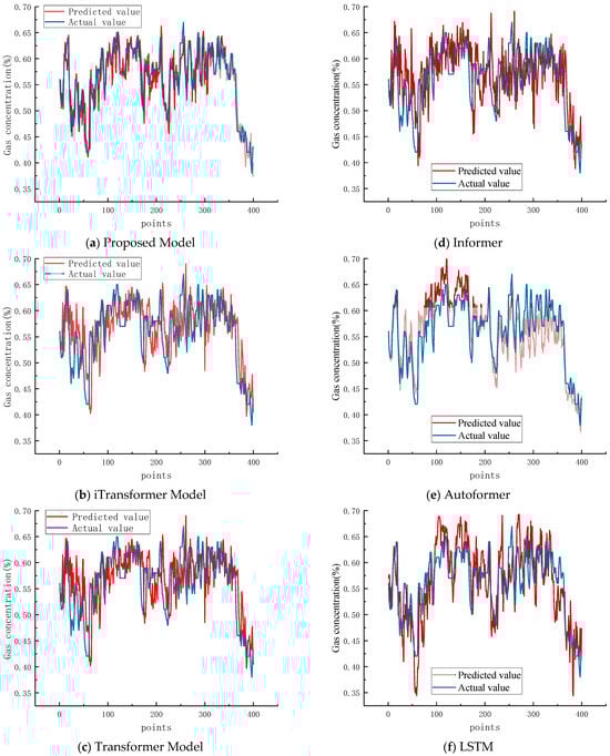 The comparison reveals that while the iTransformer model captures the general trend of gas concentration fluctuations, it produces numerous instantaneous spikes and inaccurately predicts the change amplitude. Conversely, the Transformer model exhibits noticeable deviations and lags in its predictions. As actual concentrations begin to rise or fall, the model’s predictions remain at previous levels. Even when real data show minimal fluctuations, the predicted values still exhibit local variations and deviate from reality, indicating the model’s inability to effectively capture dynamic temporal dependencies. From the perspective of real-time prediction, such delayed or oscillatory responses can lead to false or missed warnings in underground monitoring systems. In contrast, the proposed KAN-iTransformer demonstrates faster adaptive response to transient concentration changes and smoother temporal evolution, which are essential for ensuring stable and timely prediction in real coal-mine operations.
